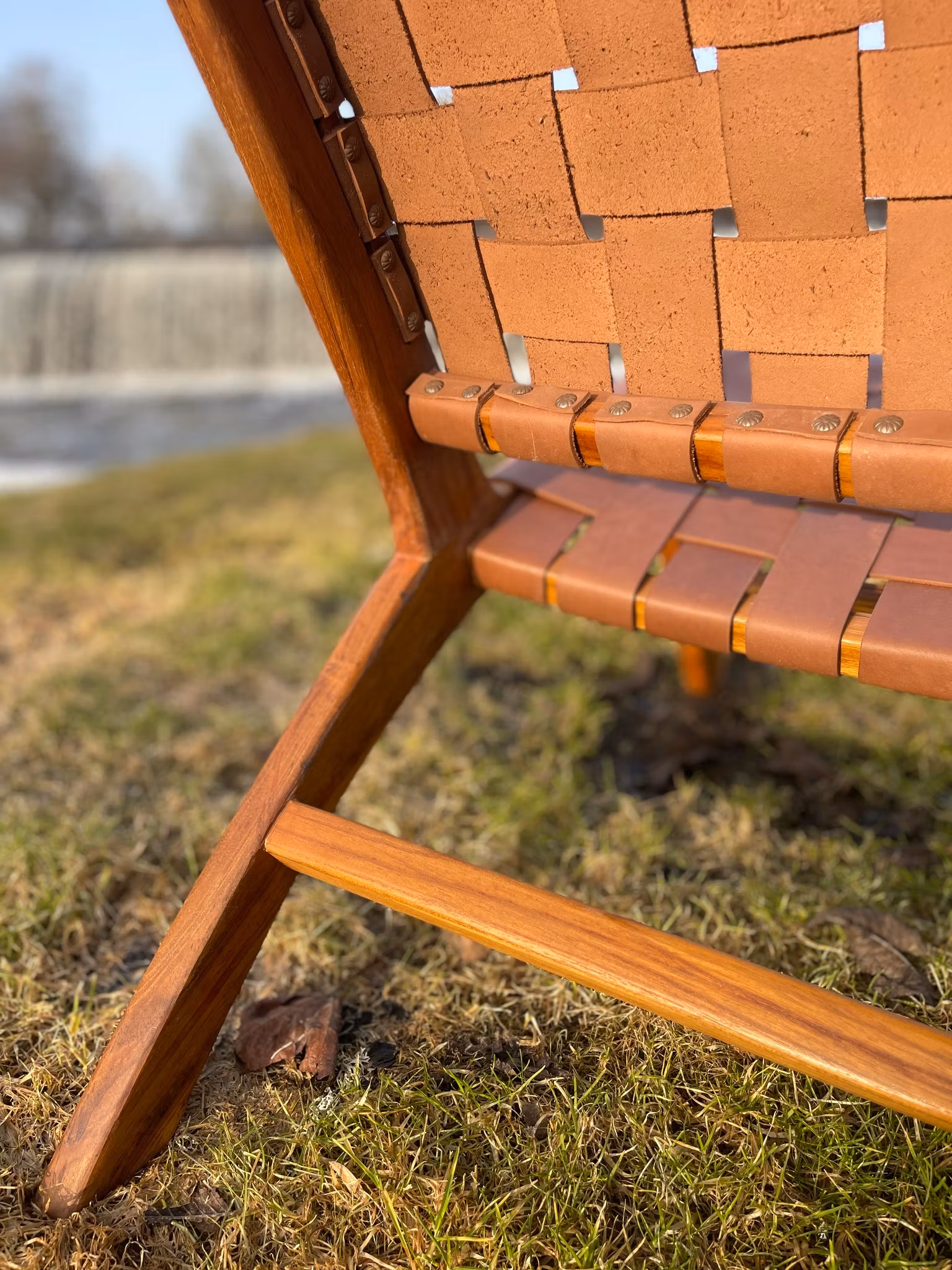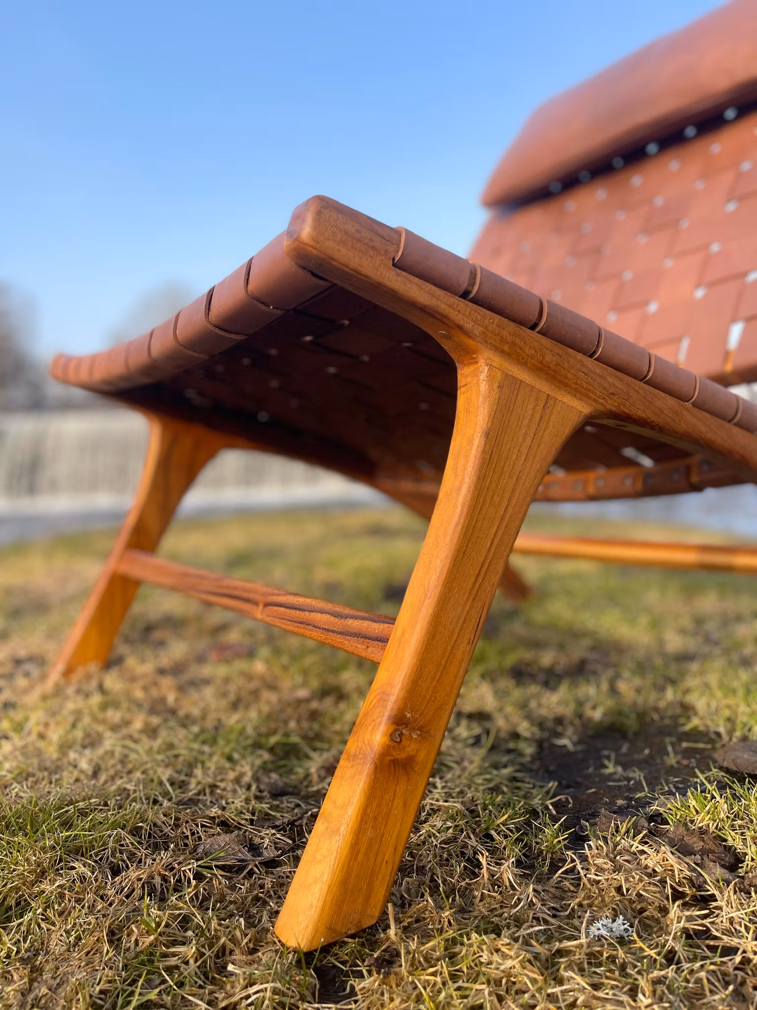 Stommen är tillverkad i massiv FSC-märkt teak med varm ton och naturlig ådring. Sits och rygg är handflätade i läder som ger fåtöljen ett levande, hantverksmässigt uttryck. Den högre ryggen tillsammans med nackkudden skapar en bekväm och inbjudande sittposition utan att förlora den luftiga siluetten.