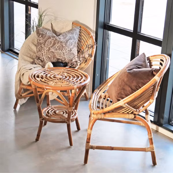 Bordet är gjort av naturrotting, ett miljösmart material som kommer från palmer som skördas, behandlas och flätas för hand till vackra rottingmöbler.