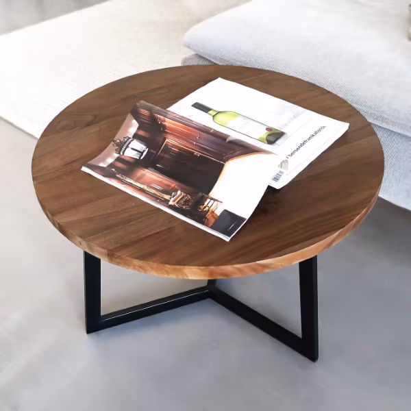 Läckert runt soffbord av valnötsfärgad massiv teak och svart metallunderrede