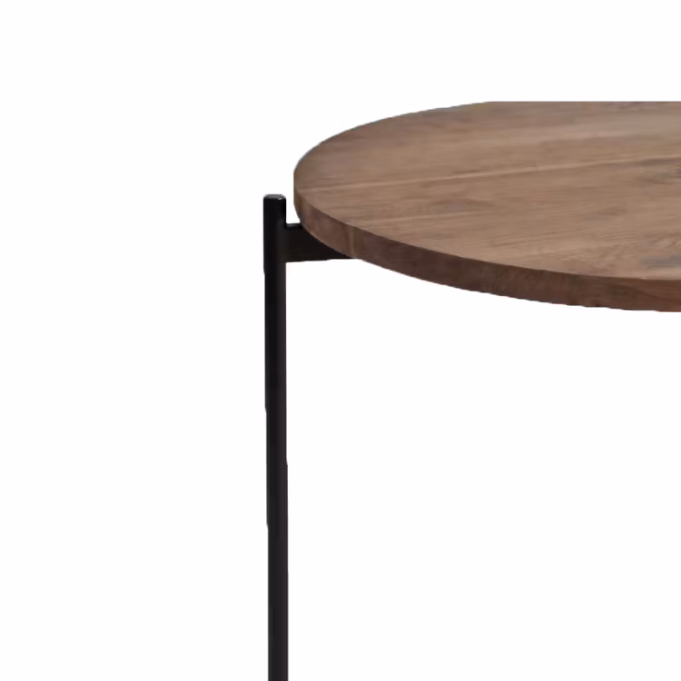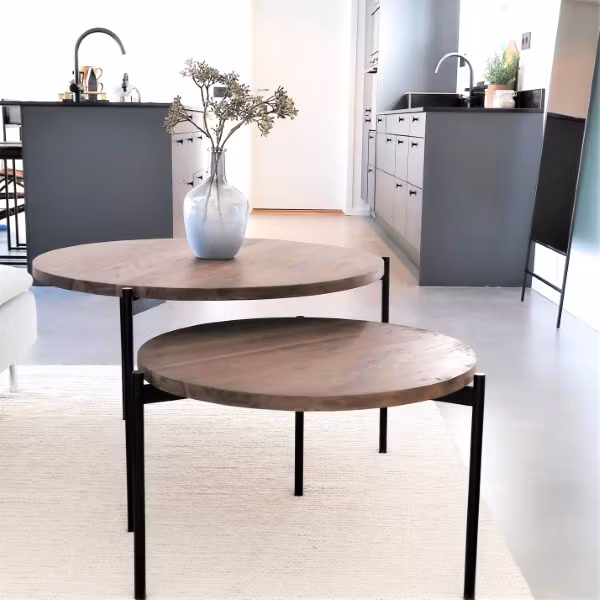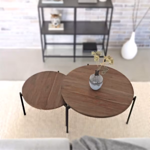Soffbord av massiv teak i skiftande valnötsfärg med specifika hårnålsben av svart metall - ett set om två stycken teakbord i olika höjd och storlek.