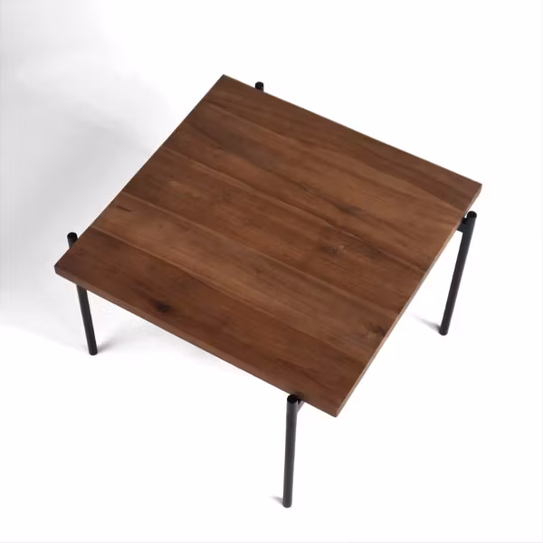 Elegant soffbord av massiv teak i skiftande valnötsfärg med specifika hårnålsben av svart metall - finns i två olika höjder.