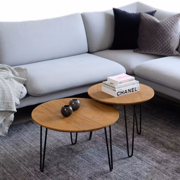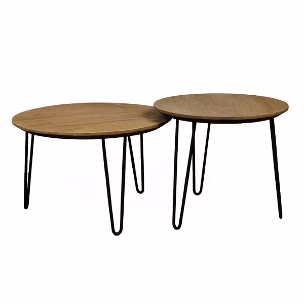 Rustika och eleganta soffbord av massiv teak med hårnålsben av svart metall - ett set om två stycken teakbord i olika höjd.