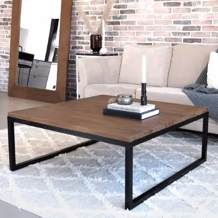Rustikt och modernt soffbord av massiv teak med lackerat svart metalunderrede – ett gediget och robust teakbord som finns i olika storlekar – här 100x100.