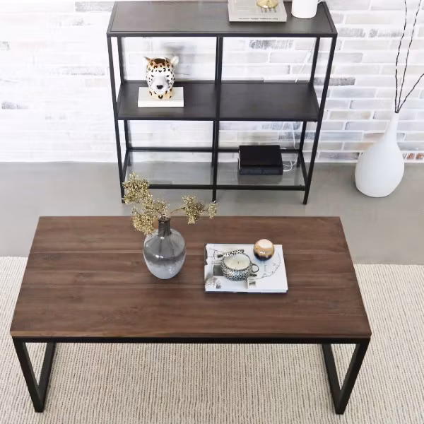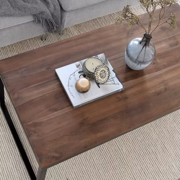 Rustikt designsoffbord av massivt trä med svarta metallben – ett gediget och robust teakbord som finns i olika storlekar – här 120x60 cm.