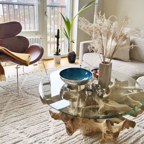 Teakrot ger unika och personliga möbler, där rotens naturliga form styr produktens utseende. Det kommer att vara möbler för dem som älskar unika föremål med en personlig touch.