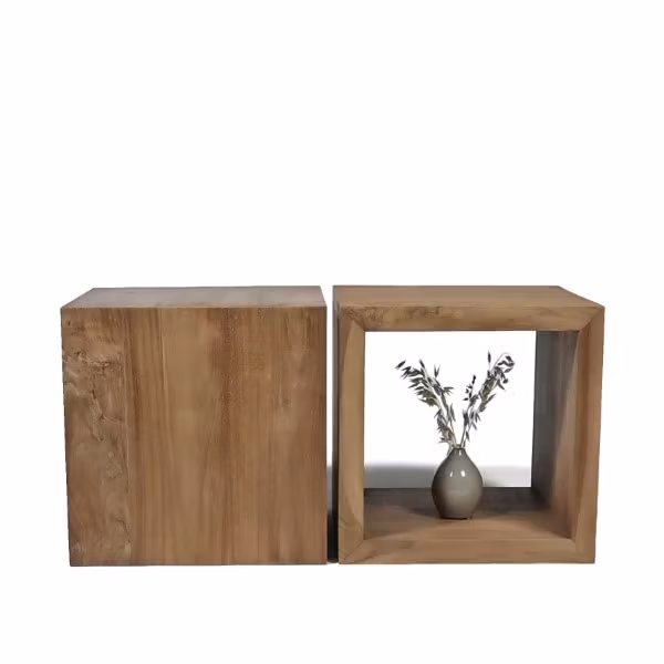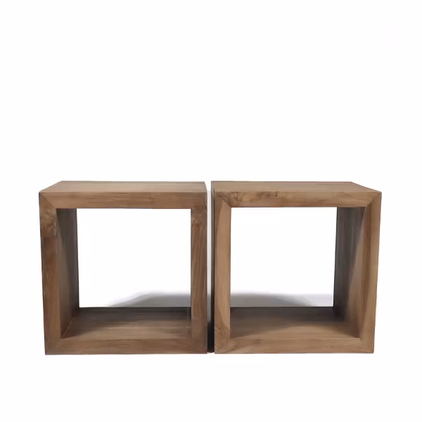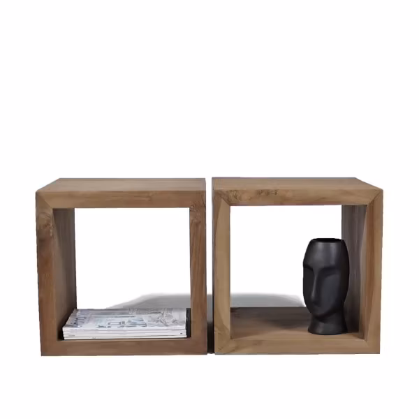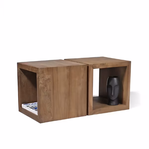 Detta stilrena och moderna designsoffbord består av två lika stora kubformade enheter tillverkade av massiv återvunnen teak av högsta kvalitet där träskivorna är 4 cm tjocka och har en slät yta. De två borden är i storleken M (medium) och kan kombineras på olika sätt. Till exempel som ett soffbord med olika sidor fram, två sidobord eller sängbord. Man kan flytta runt dom lite som man vill och efter behov.