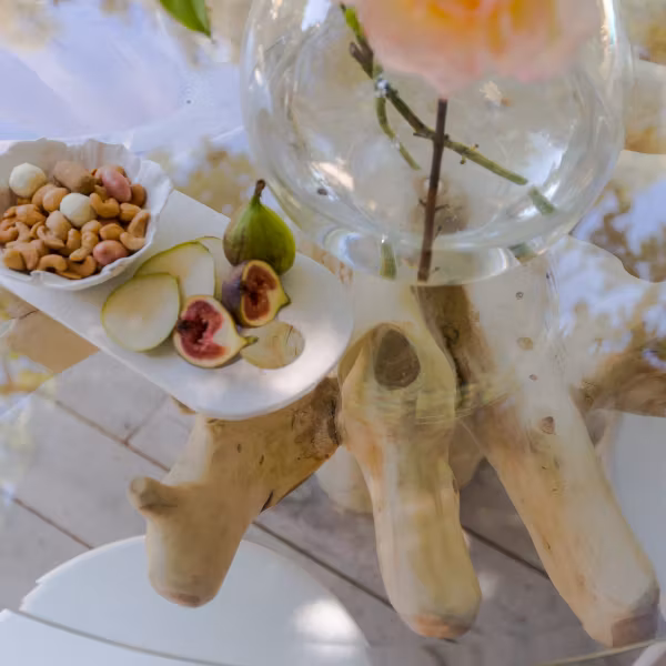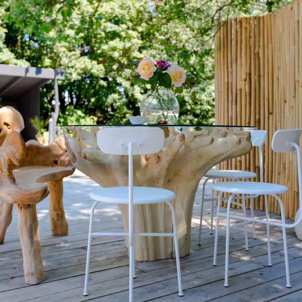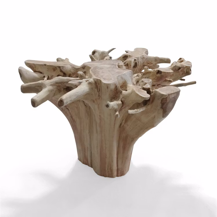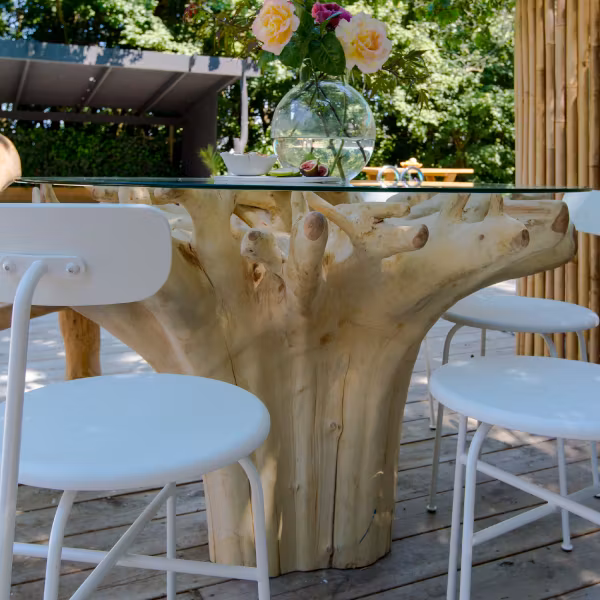Om du letar efter ett personligt matbord har du hittat rätt: – foten är gjord av massiv teakrot och bordskivan av glas. – ett handtillverkat unikt matbord.