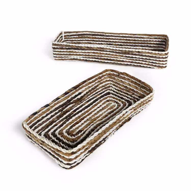 Handflätade förvaringskorgar av bananlöv i naturliga milda färger. Praktiska förvaringskorgar för småförvaring i badrum, sovrum eller kök.