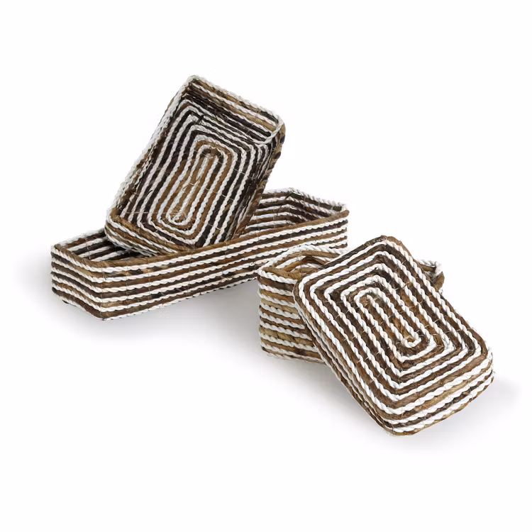 Korgarna är flätade för hand av sjögräs i naturnära nyanser och ett enkelt randigt mönster.