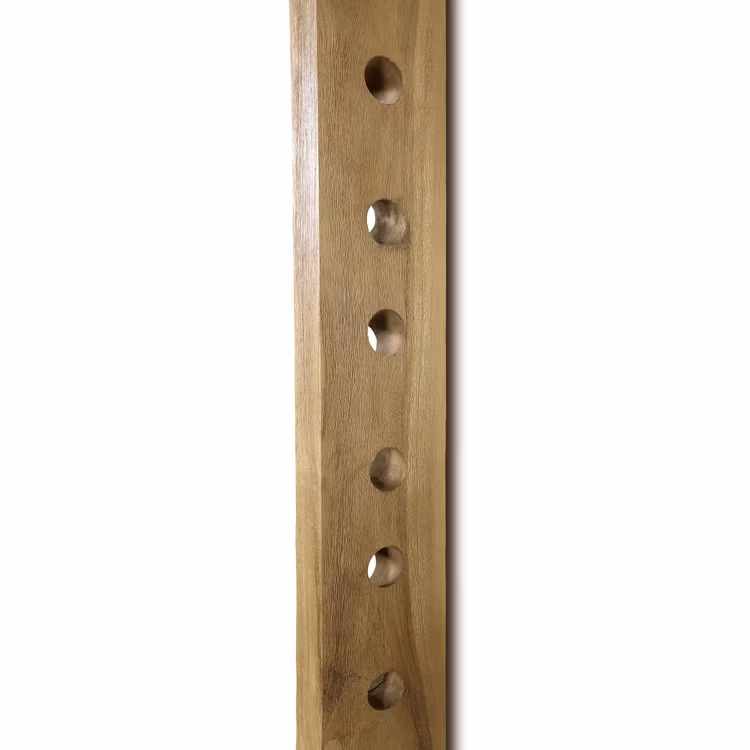 Vinställ som fästs på väggen – där man sticker in flaskhalsarna i hålen – ett handgjort och rustikt vinställ av massiv teak som rymmer 14 vinflaskor.