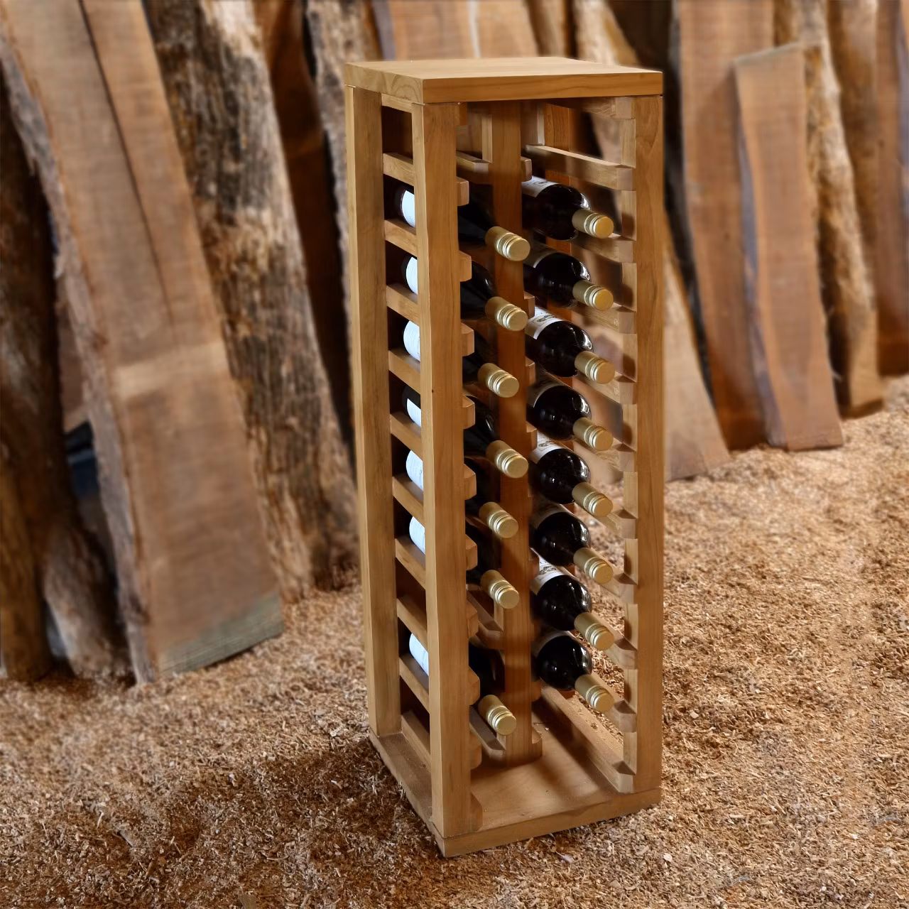 Kevin är ett stadigt och karaktärsfullt vinställ i massiv teak, skapat för att stå fritt på golvet. Ett vackert och praktiskt sätt att förvara vin – i köket, vardagsrummet eller matsalen – där både flaskorna och möbeln får synas.