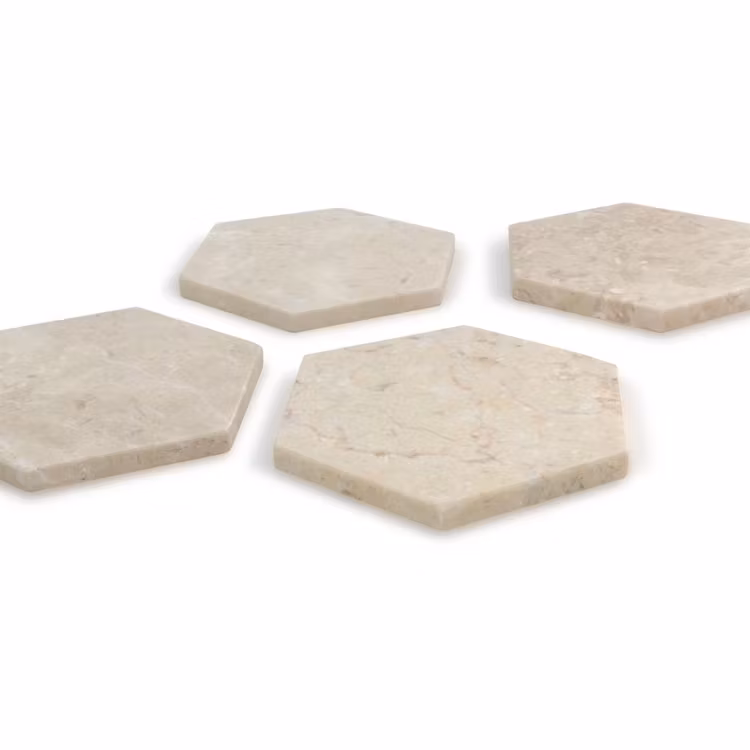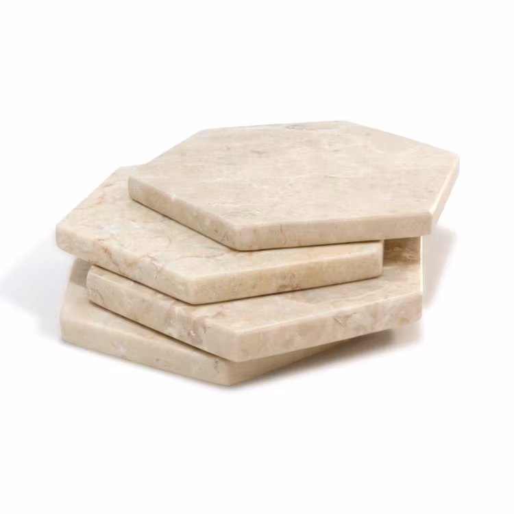 De här glasunderläggen är handgjorda av vacker beige marmor, men finns även i en ljusgrå variant.