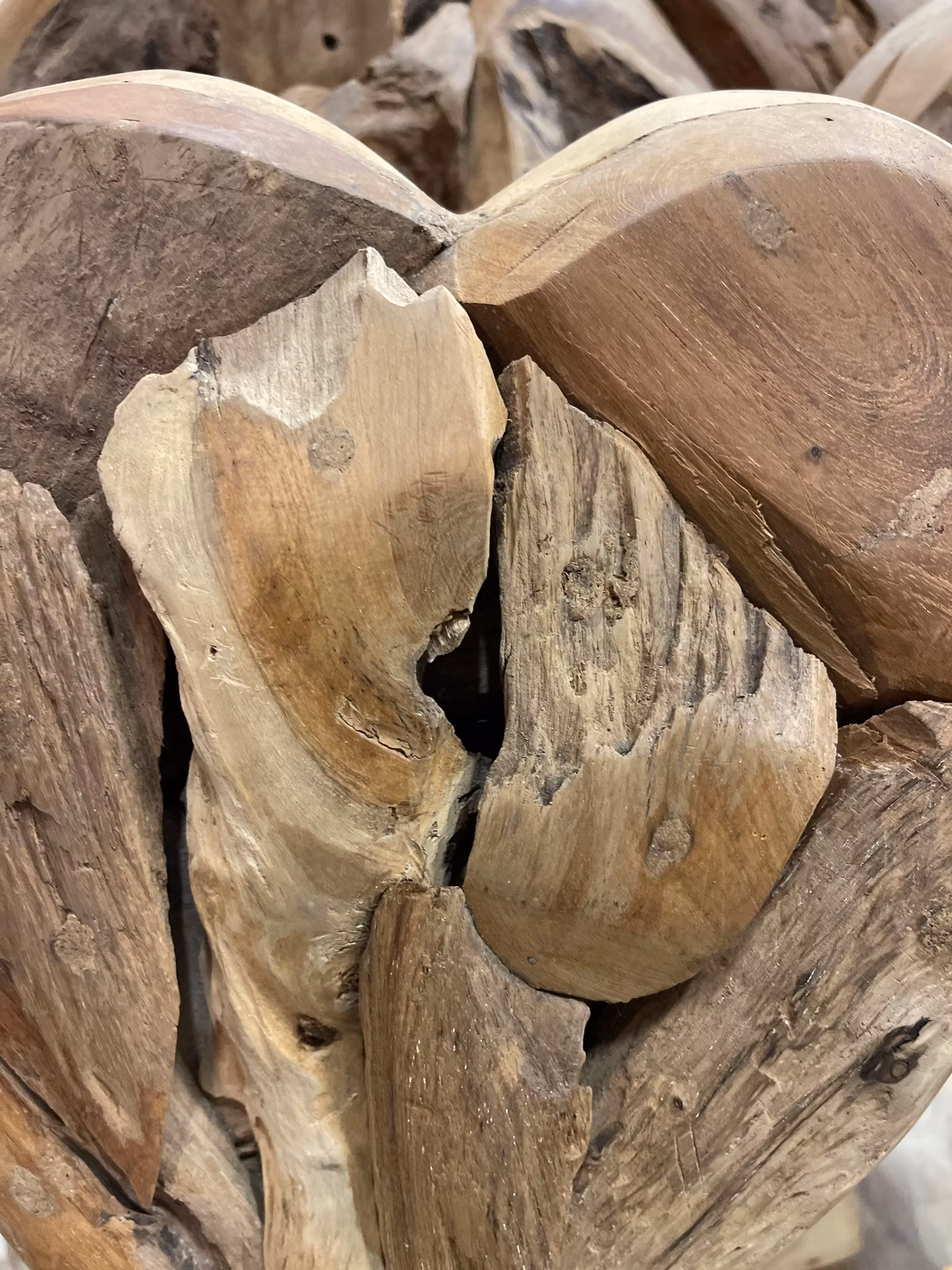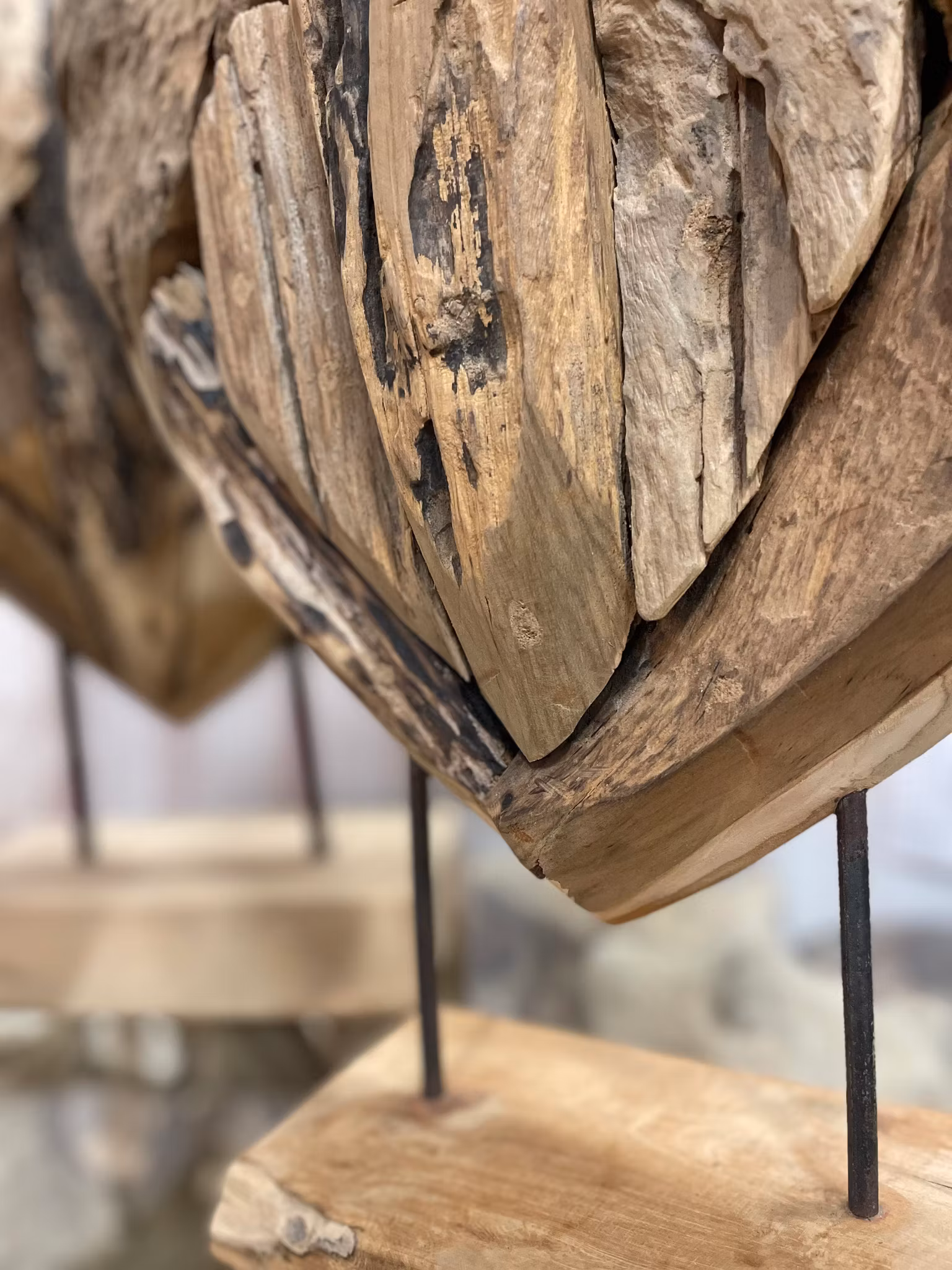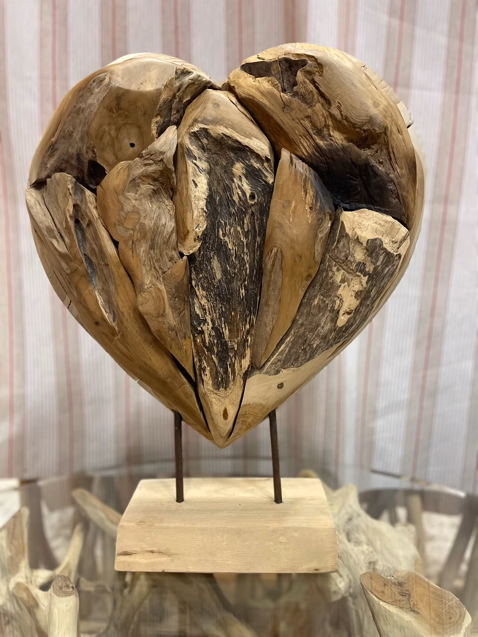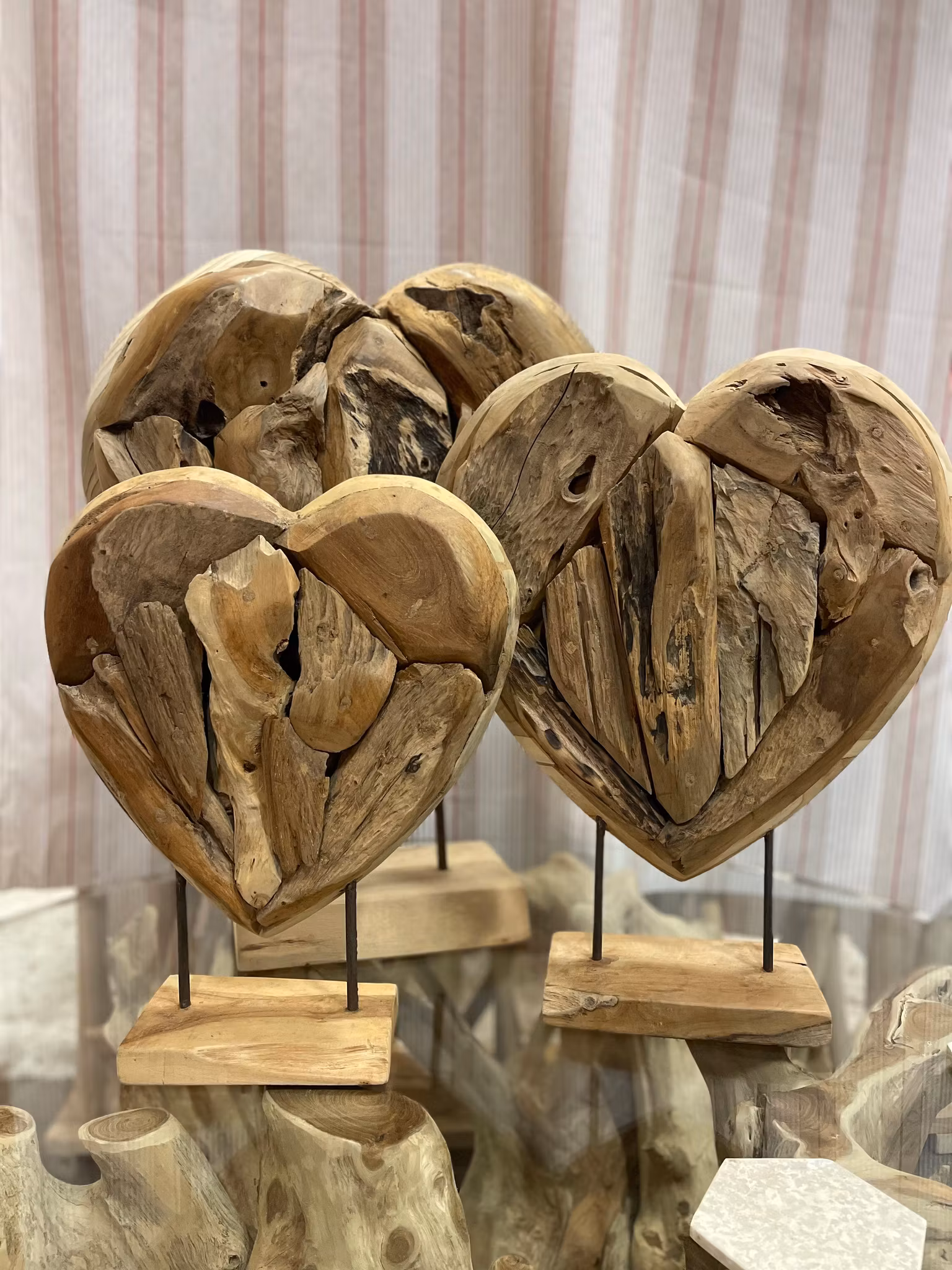 Ett hjärta som verkligen känns. Dessa vackra hjärtan är handgjorda av återvunnen teak – bitar av trä som levt ett långt liv innan de varsamt fogats samman till nya former. Varje hjärta har sin egen personlighet, sina egna mönster och färgskiftningar, och inget är det andra likt. Strukturen, tyngden och den rustika ytan gör dem till ett konstverk i sig. Perfekta i hallen, i sovrummet, på ett sideboard eller i ett uterum där naturmaterial får tala. De står stabilt på sin träfot och passar lika fint ensamma som i grupp. Ett varmt och tidlöst inredningsobjekt – skapat för att hålla i många år framöver.