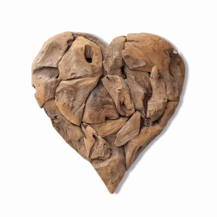 Trähjärtat är handgjort av återvunnen teak – spillmaterial som återanvänds. Träbitarna har fått behålla sin organiska form för att skapa en riktigt naturnära känsla i det här inredningsföremålet.