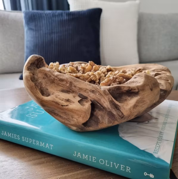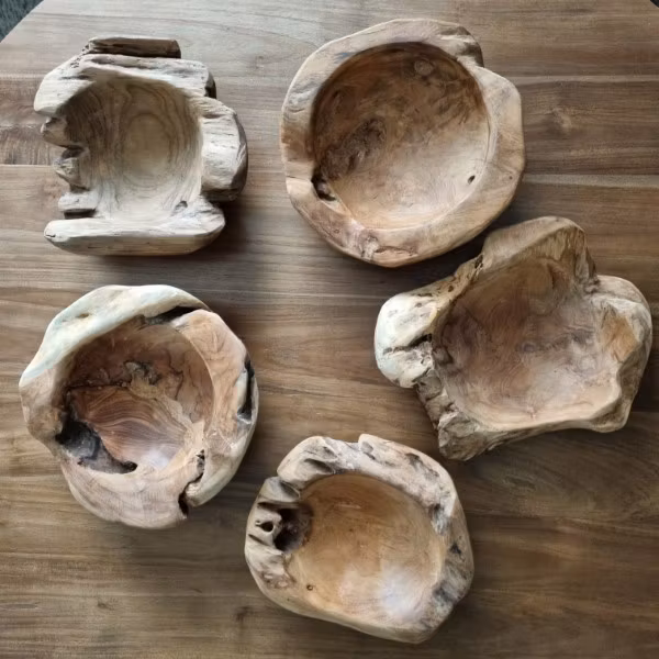 De här läckra teakskålarna är gjorda av miljövänlig teakrot och finns i tre olika storlekar. Skålarna är handgjorda och tillverkade med rotens naturliga form som utgångspunkt, varför varje skål är helt unik.