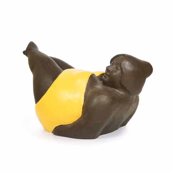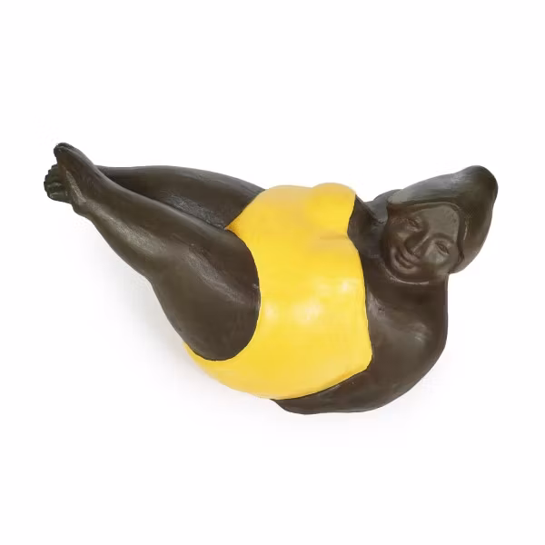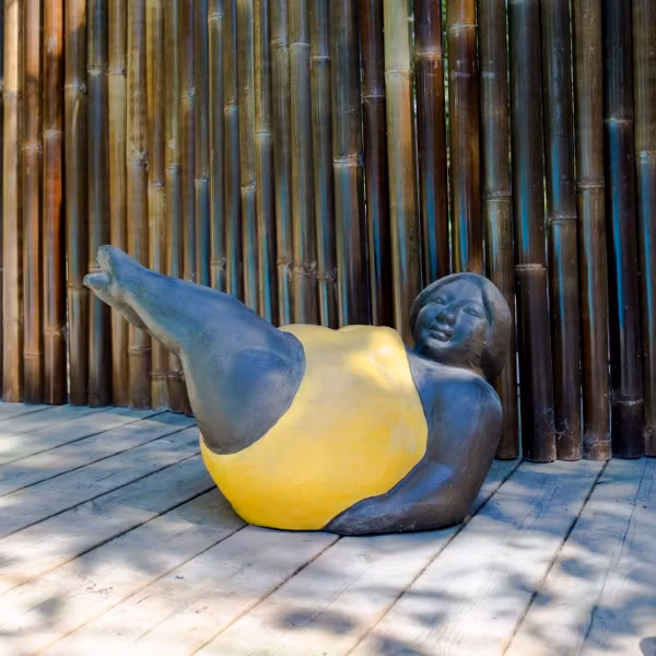 En skulptur i form av rar och rundnätt baddam som gymnastiserar – en rejält tilltagen betongsskulptur för din inredning eller som prydnad i trädgården.
