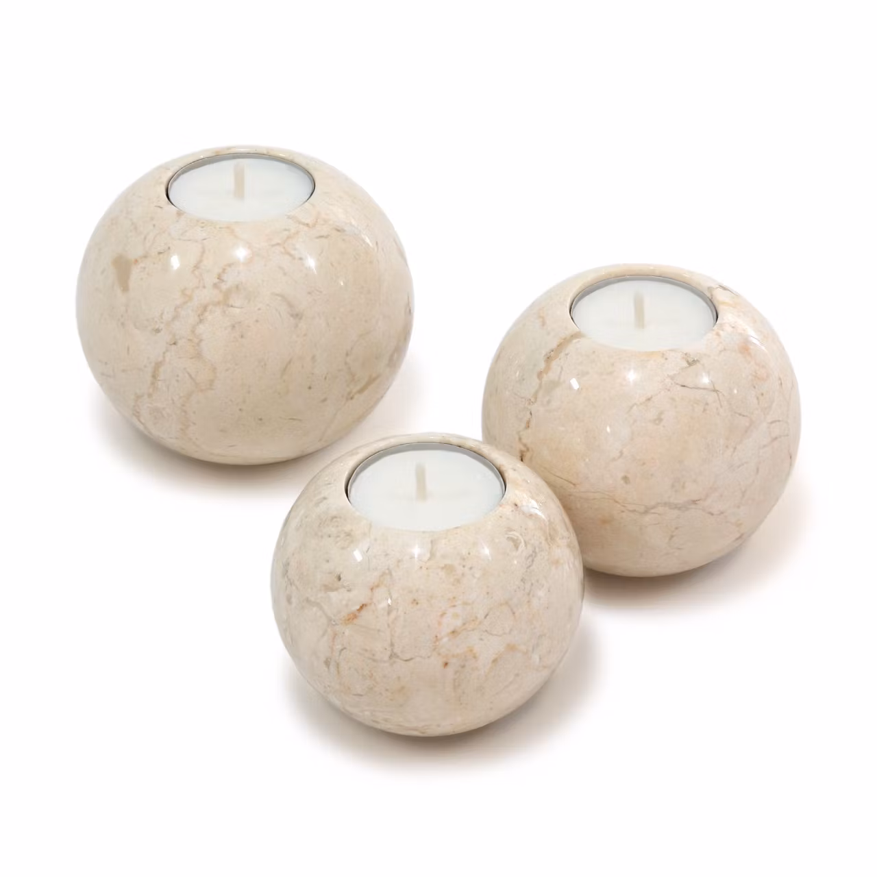 Ester är ett set om tre klotformade ljushållare i massiv marmor. De mjuka formerna och den naturliga tyngden ger ett lugnt och harmoniskt uttryck som passar i såväl moderna som klassiska miljöer.