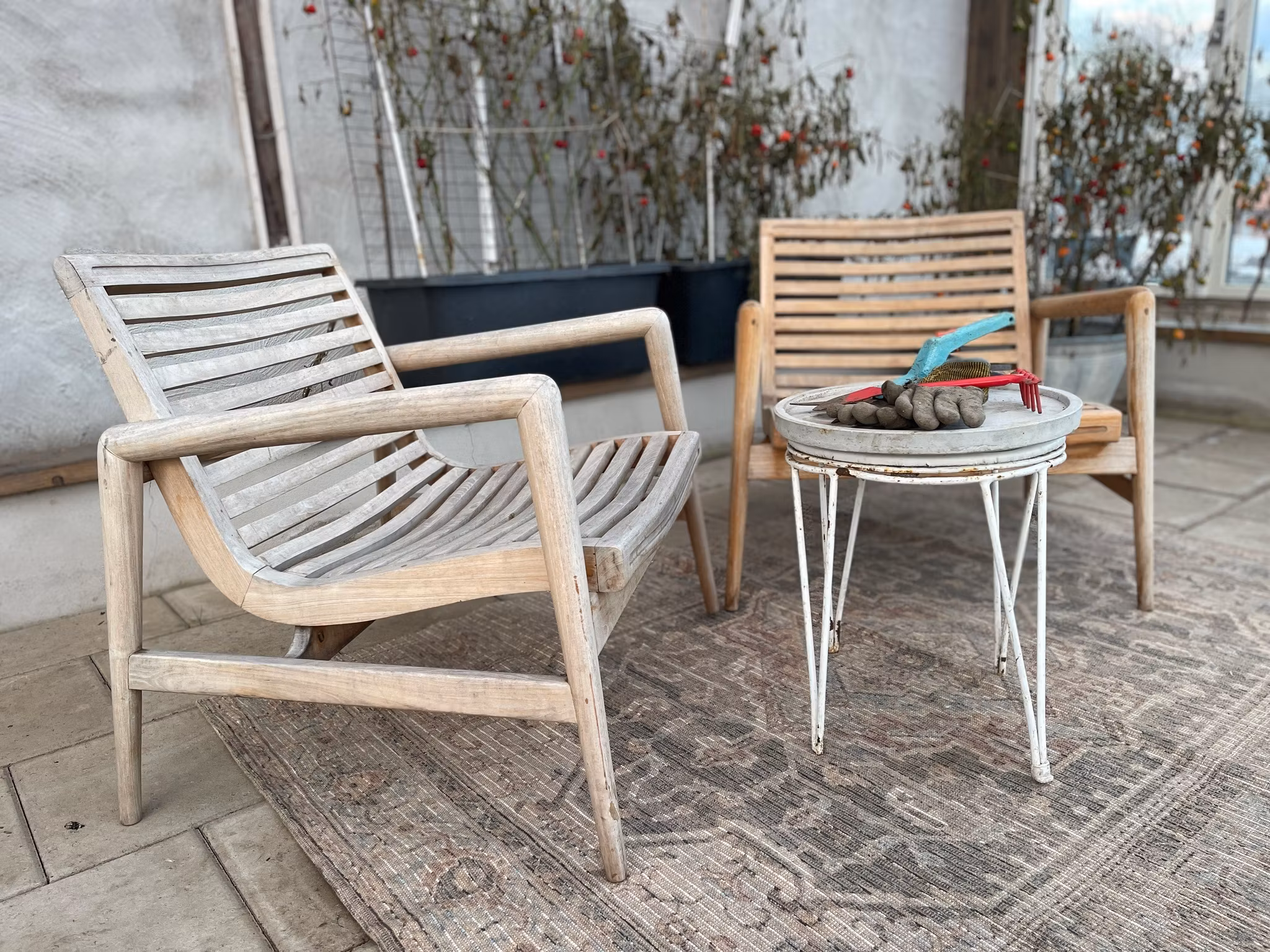Den massiva teaken ger stabilitet, tyngd och lång livslängd. Teak är ett naturligt tåligt träslag som lämpar sig särskilt väl för utemöbler och klarar både väder och användning över tid. Med åren utvecklar träet en levande patina. Vissa uppskattar den silvergrå tonen som växer fram, andra väljer att bevara den varma kulören med olja. Båda uttrycken är lika självklara.