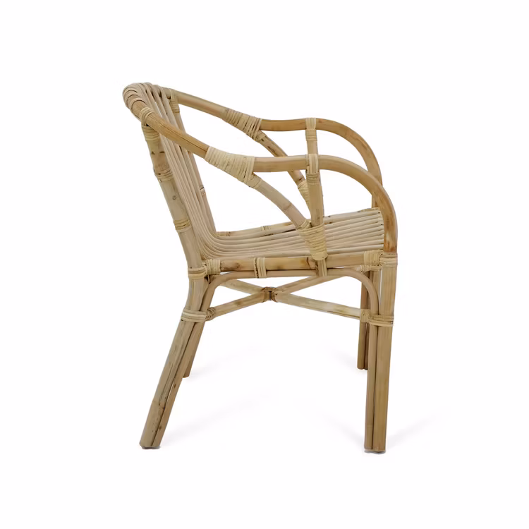 Det här är en vacker, handgjord rottingstol av ren naturrotting, som är ett miljövänligt, slitstarkt och långsiktigt hållbart material. Stolen är lättviktig och utformad för att sitta bekvämt i men en bakåtlutad ryggstöd. Den kan användas både som matstol eller loungestol. Rottingstolen Estelle passar lika bra utomhus som inomhus, i vardagsrummet, sovrummet eller hallen. Det ingår även en enkel vit dyna till varje stol.