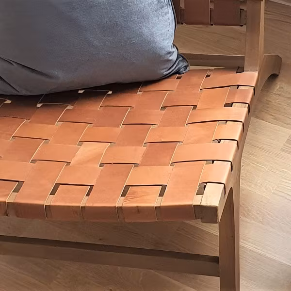 Loungestol av teak med flätat läder i sits och ryggstöd - en handgjord teakmöbel av högsta kvalitet i modern och stilren design.