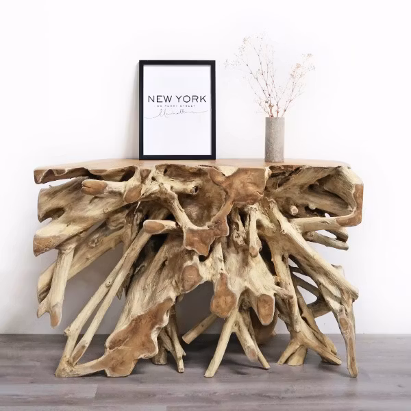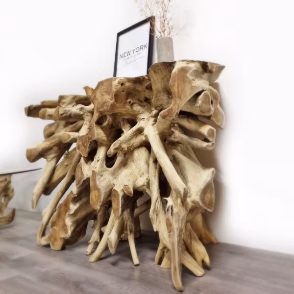 Vackert sidobord av teakträ – ett helt unikt konsolbord av miljövänligt spillmaterial från teakrot – en handgjord teakmöbel.
