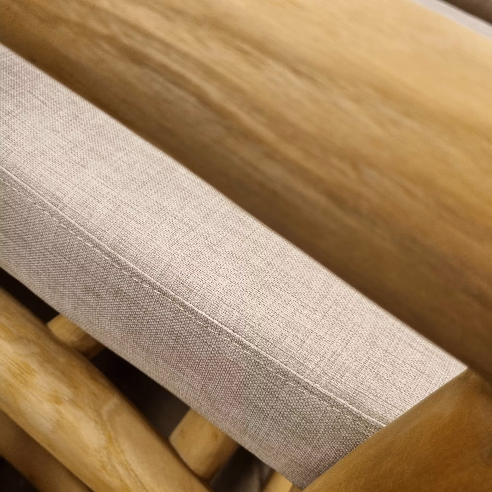 Tillverkad av massiva teakgrenar är varje grupp unik i struktur och uttryck. Träets naturliga variationer gör att ingen möbel är exakt den andra lik. De ljusa dynorna skapar en harmonisk kontrast mot teakens varma ton och förstärker helhetens mjuka och naturliga uttryck.